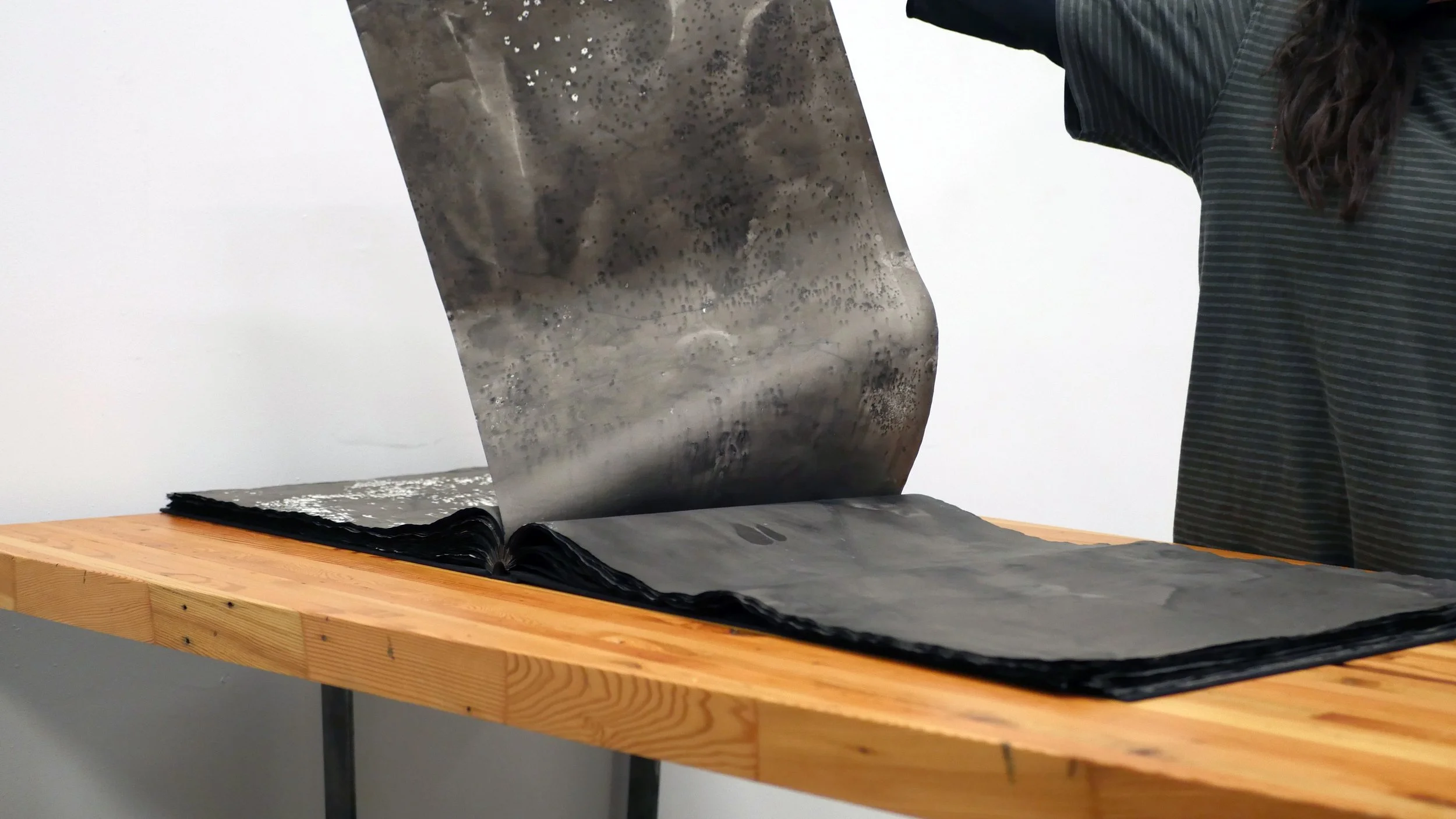 Iterating upon a book I created for a Dark Sea Sounds video in 2020, this one was constructed to be twice as large. Like the original Sea Sounds book, it features hand-dyed pages that mix India Ink and sea salt, and it unfolds to six feet wide when fully open. This makes viewing the book a tactile and aural meditation, intentionally repetitive, and also requires the viewer's gross physicality. Turning the large pages becomes a full-body experience.